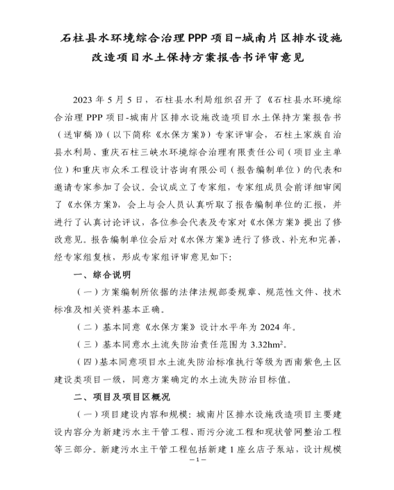 2、石柱县水环境综合治理PPP项目-城南片区排水设施改造项目水土保持方案报告书专家审查意见