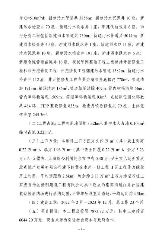 项目概况:本工程建设主要内容分为新建污水主干管工程、雨污分流工程和现状管网整治工程等三部分。新建污水主管工程包括新建一座幺店子泵站,新建污水管道共3858m;新建污水沉泥井10座,新建污水检查井70座,新建污水跌水井1座,新建倒虹吸井6座。雨污分流工程包括新建雨水管道共750m;新建污水管道共5014m;新建雨水检查井40座,新建雨水跌水井1座,新建雨水口11座;新建污水沉泥井10座,新建污水检查井191座,新建污水跌水井6座;新建合流管道截流井16座。现状管网整治工程包括开挖修复工程和非开挖修复工程,开挖修复工程翻建污水管道1582m,新建污水检查井112座;非开挖修复工程主要为清除井底积泥778m³,管道清淤1913m、箱涵清淤185m³、管道结垢清除407m、管内树根清除56m、管内障碍物清理1509m、箱涵障碍物清理93m³、点状原位固定环数484环、FIPP整理修复835m、检查井喷涂修复共79座、土体化学注浆245.3m³。