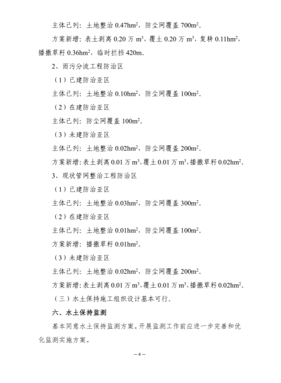 雨污分流工程防治区 | 主体设计:土地整治0.12hm2;方案新增:表土剥离0.01万m3,覆土0.01万m3。 | 方案新增:播撒草籽0.02hm2。 | 主体设计:防尘布覆盖400m2。 | |||||||||||||||||||