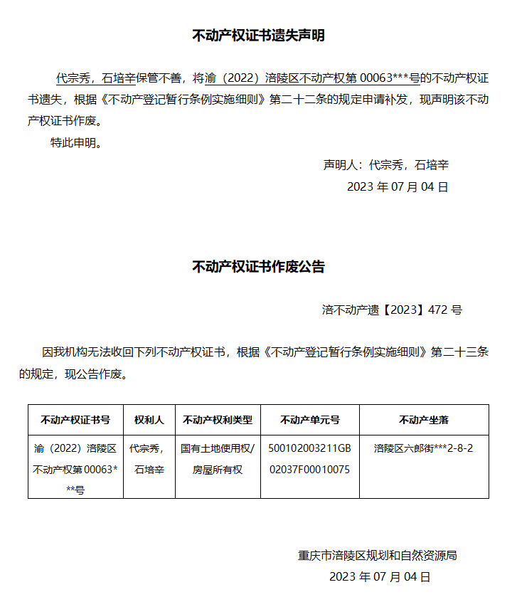 下一篇:集体不动产权证书遗失(灭失)声明-虎峰所登声明(2023)集字第160号(王*伟)