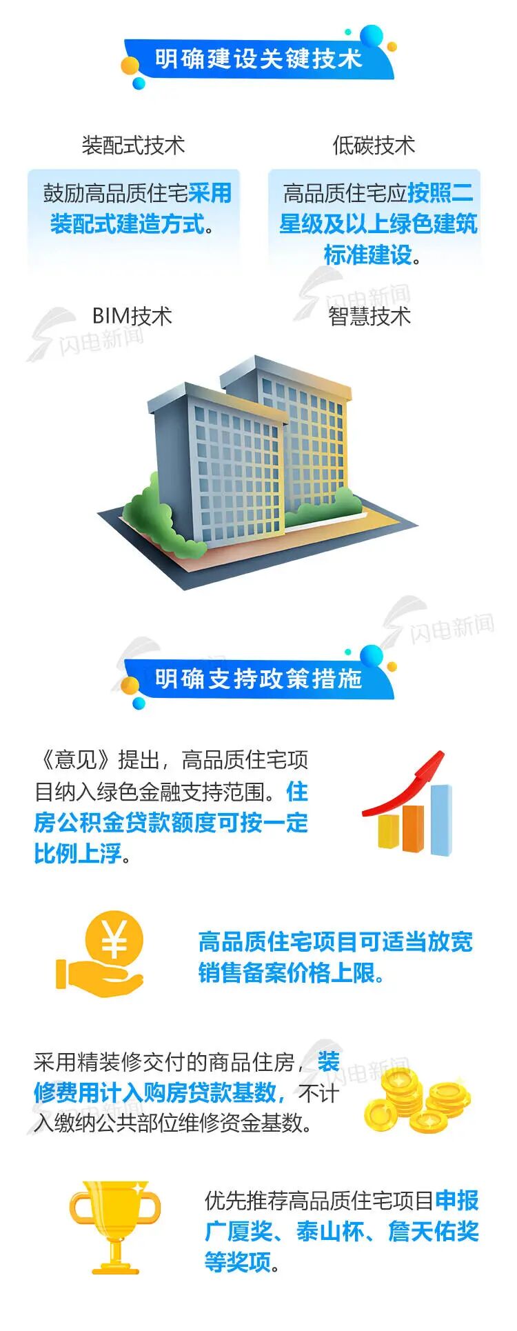 《指导意见》明确,高品质住宅项目纳入绿色金融支持范围。住房公积金贷款额度可按一定比例上浮。高品质住宅项目可适当放宽销售备案价格上限,对应的开发企业在参与招投标和信用评价享受适度优惠政策。鼓励各市对开发企业配置高于现行标准规范建设的公共配套设施给予免计容奖励。采用精装修交付的商品住房,装修费用计入购房贷款基数,不计入缴纳公共部位维修资金基数。