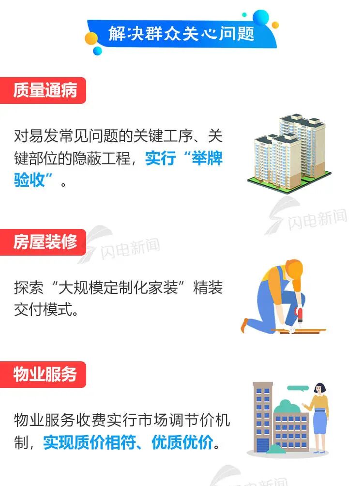《指导意见》聚焦解决群众关心问题,要求加强渗漏、裂缝、空鼓、管线不通、地漏和烟道返味串味、噪声干扰等质量常见问题防治。对易发常见问题的关键工序、关键部位的隐蔽工程,实行“举牌验收”。鼓励高品质住宅精装修交付,提倡个性化、定制化、集成化装修,探索“大规模定制化家装”精装交付模式,实现按需研发、按需组项、菜单购买,避免千房一面并减少资源浪费。物业服务收费实行市场调节价格机制,实现质价相符、优质优价。厘清物业和全体业主的权责关系,创造和谐邻里环境。