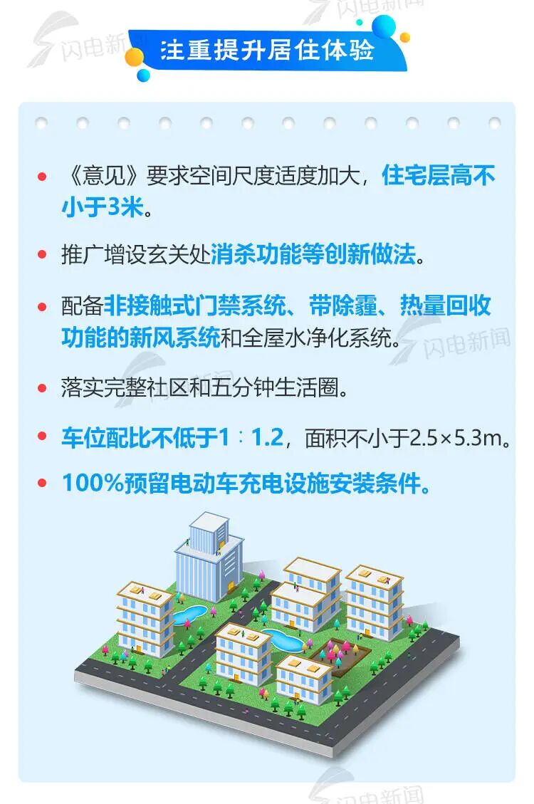 高品质住宅要注重提升居住体验。《意见》要求空间尺度适度加大,住宅层高不小于3米。满足住宅的休憩、娱乐、办公等混合功能使用,合理设置健身、交流、消毒等多功能空间,推广增设玄关处消杀功能等创新做法。