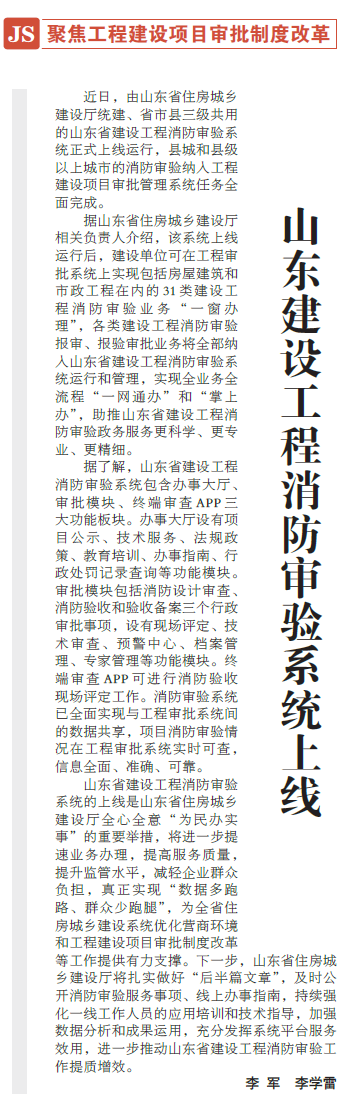 近日,由山东省住房和城乡建设厅统建、省市县三级共用的山东省建设工程消防审验系统正式上线运行,县城和县级以上城市的消防审验纳入工程建设项目审批管理系统任务全面完成。
