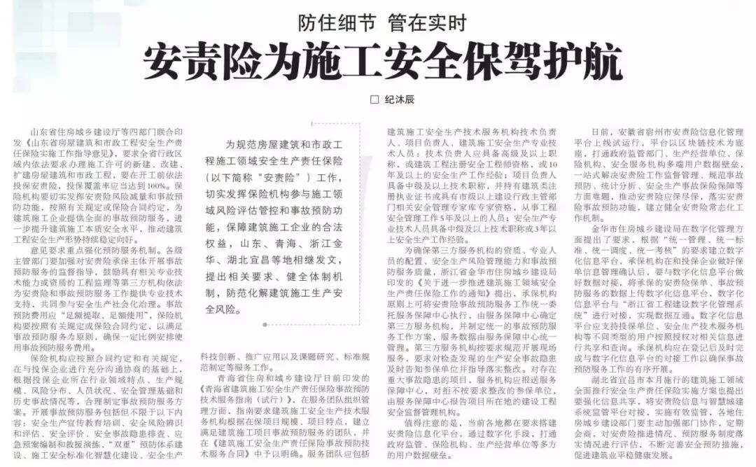 为规范房屋建筑和市政工程施工领域安全生产责任保险(以下简称“安责险”)工作,切实发挥保险机构参与施工领域风险评估管控和事故预防功能,保障建筑施工企业的合法权益,山东、青海、浙江金华、湖北宜昌等地相继发文,提出相关要求、健全体制机制,防范化解建筑施工生产安全风险。