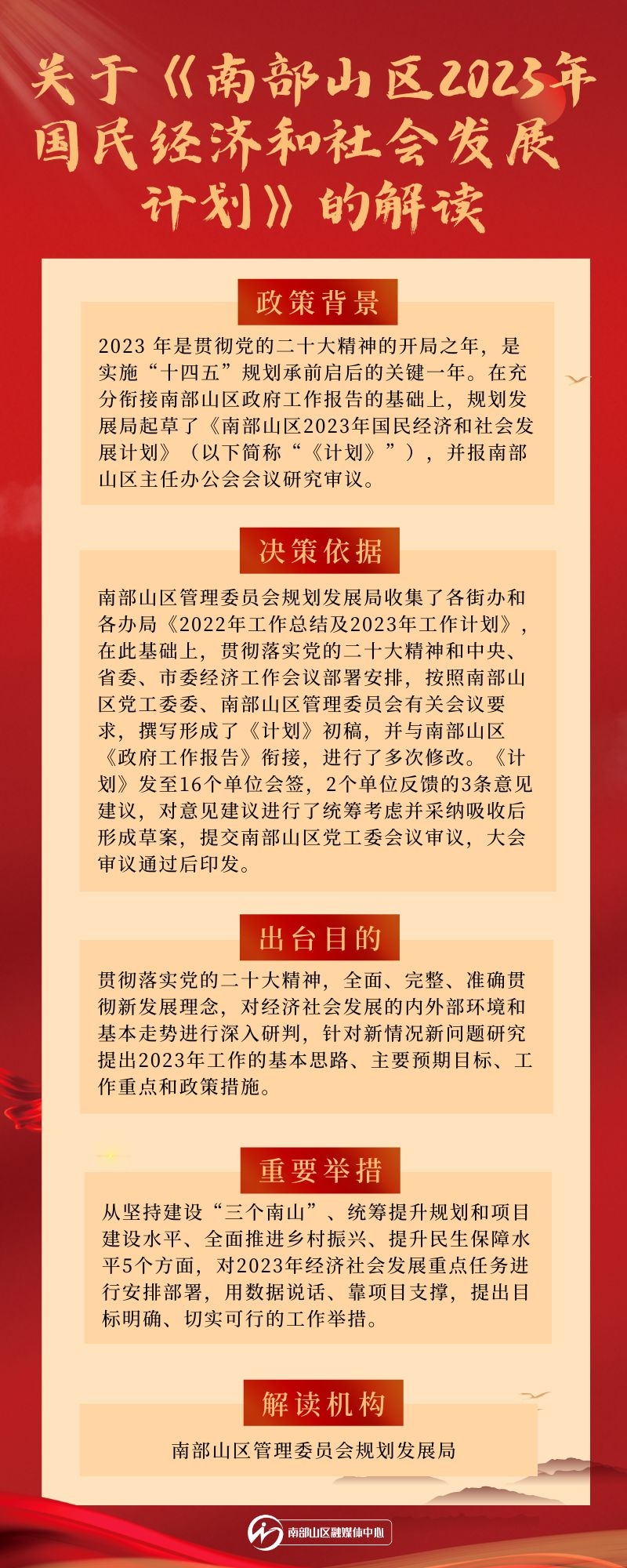 从坚持建设“三个南山”、统筹提升规划和项目建设水平、全面推进乡村振兴、提升民生保障水平5个方面,对2023年经济社会发展重点任务进行安排部署,用数据说话、靠项目支撑,提出目标明确、切实可行的工作举措。
