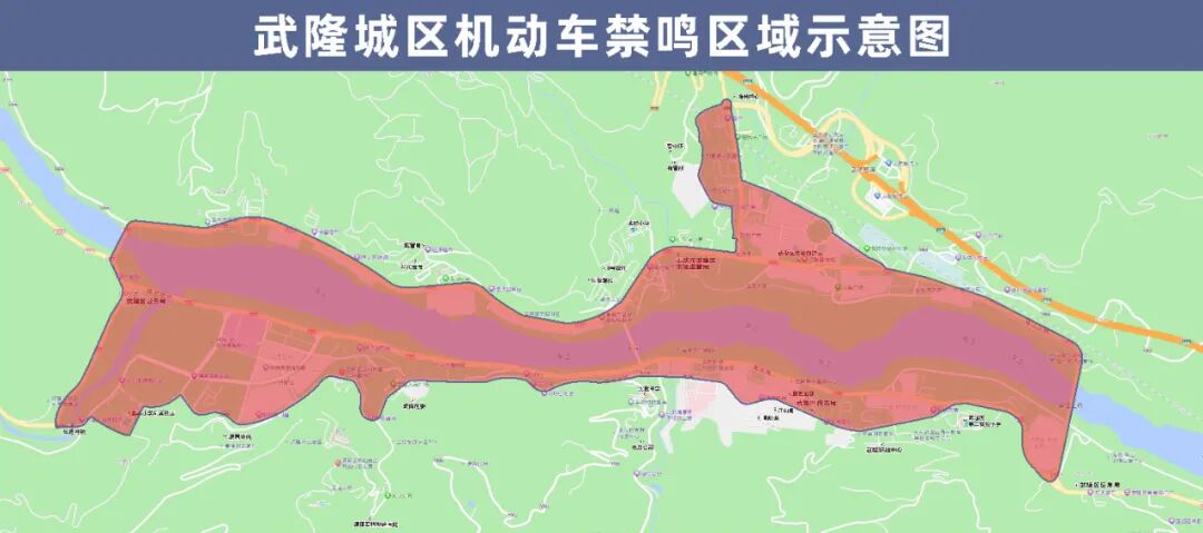 三桥环岛—第二实验小学—建设东路—金海环岛—建设中路—建设西路—疾控中心—实验小学凤溪校区—长途河桥—南滨路—乌江二桥—芙蓉西路—芙蓉中路—宏福酒店—柏杨路—桂圆街—拘留所路口—G65包茂高速武隆收费站下道路口—柏杨路江北幼儿园—体育馆—火车站—乌江三桥—三桥环岛以内区域(以上区域含本地址),以上各点周边及以内区域均禁鸣喇叭。