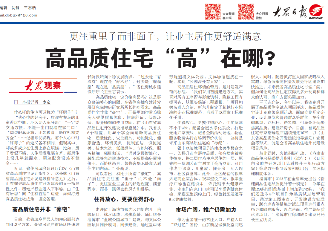 作为全国唯一的常住人口、户籍人口“双过亿”省份,山东新型城镇化空间还很大。同时,随着黄河重大国家战略深入实施、绿色低碳高质量发展先行区建设加快推进,未来我省高品质住宅市场广阔。但如何让高品质住宅获得更多开发商和群众的认可,推广方面仍需加力。
