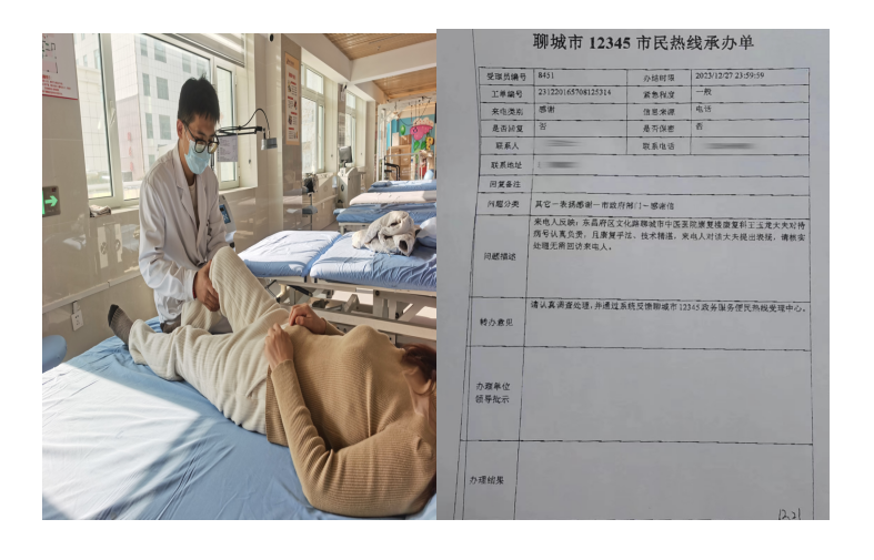 近日,聊城市市中医医院收到一封来自聊城市“12345”市民热线的表扬件,市民吕女士对聊城市市中医医院康复大厅治疗师王玉龙的周到服务和精心诊疗表达了衷心的感谢!她表示,在中医院康复治疗过程中王大夫认真负责,且康复技术精湛,消除了病痛对其带来的长期困扰。