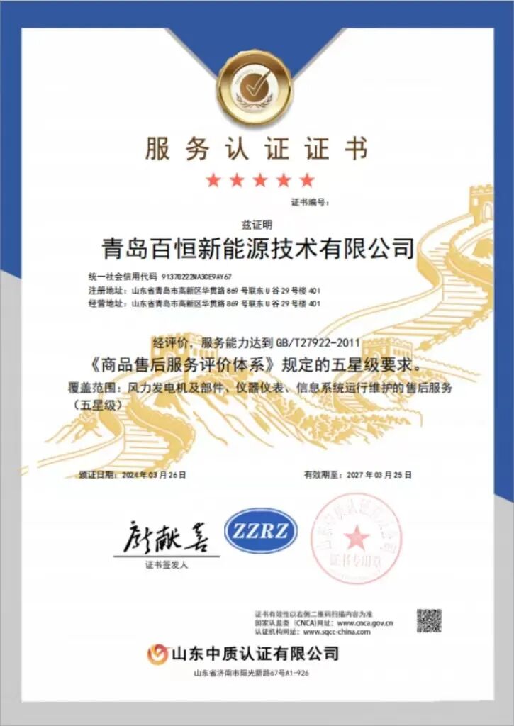 据悉,《商品售后服务评价体系》是国家批准的首个全国性、全行业服务类权威认证,亦是衡量企业服务水平高低的“试金石”,旨在通过评估企业的服务水平,以不同等级来区分企业的服务优质程度,“五星级”是最高等级认证。百恒新能源此次顺利通过商品售后服务评价体系最高级别认证,是企业锚定风电赛道领域深耕,赢得市场肯定的有力证明。![]()
