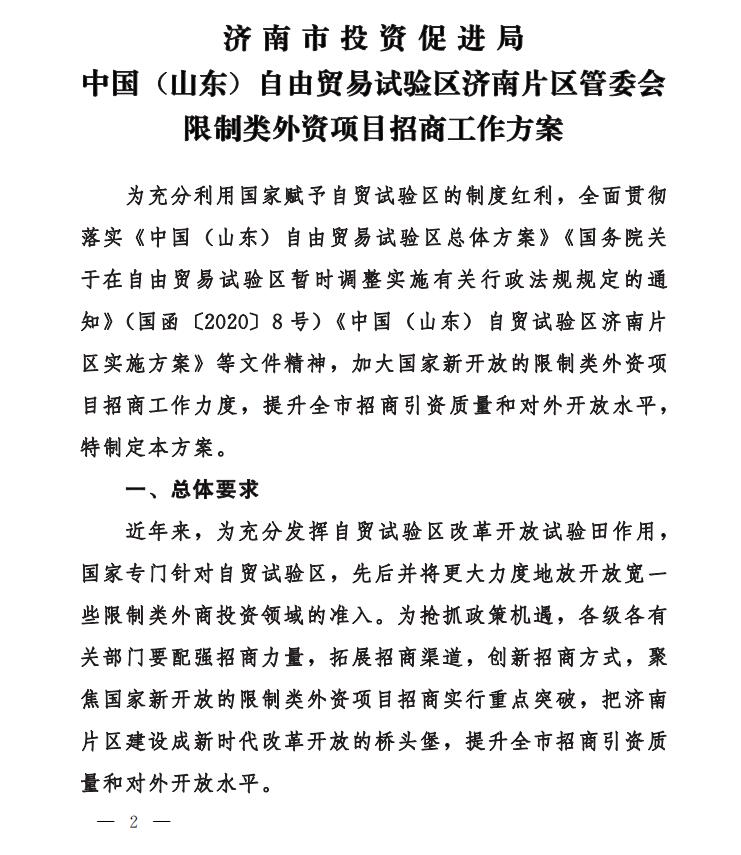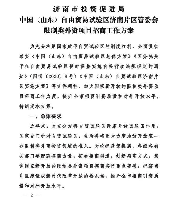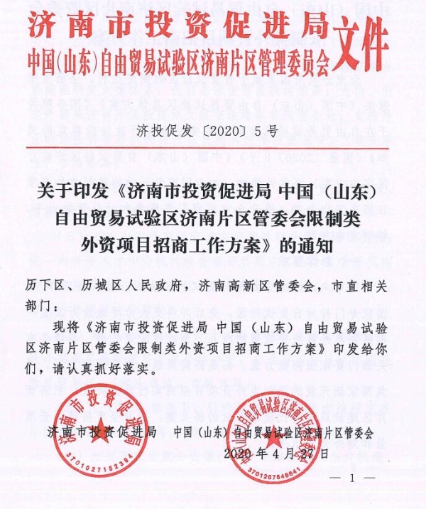 关于印发《济南市投资促进局 中国(山东)自由贸易试验区济南片区管委会限制类外资项目招商工作方案》的通知.doc