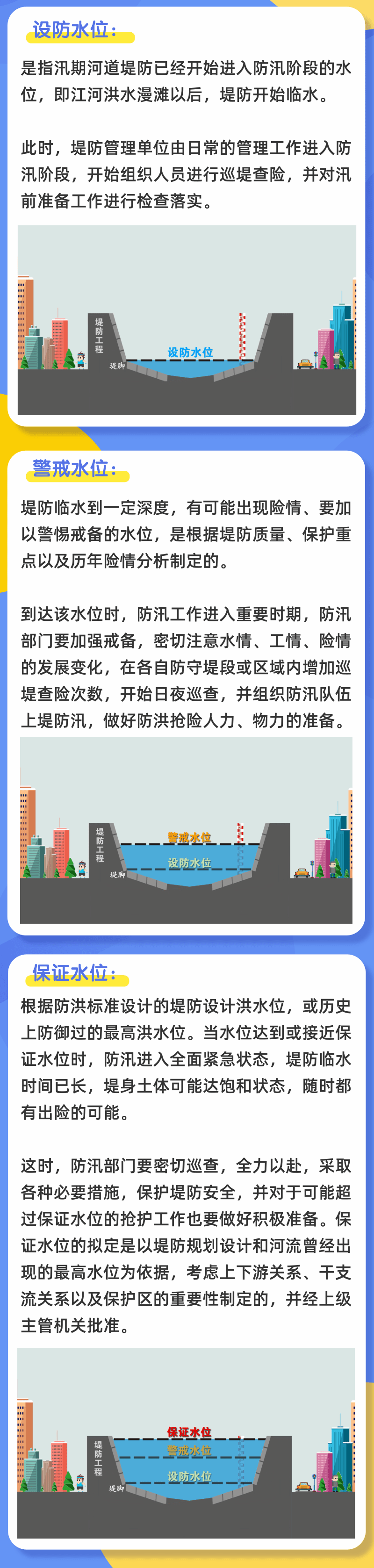 进入汛期后,江河水位上涨,防汛工作全面展开,根据水位高低及其对堤防安全的威胁程度,一般将防汛水位划分为三个等级,水位由低到高依次是: