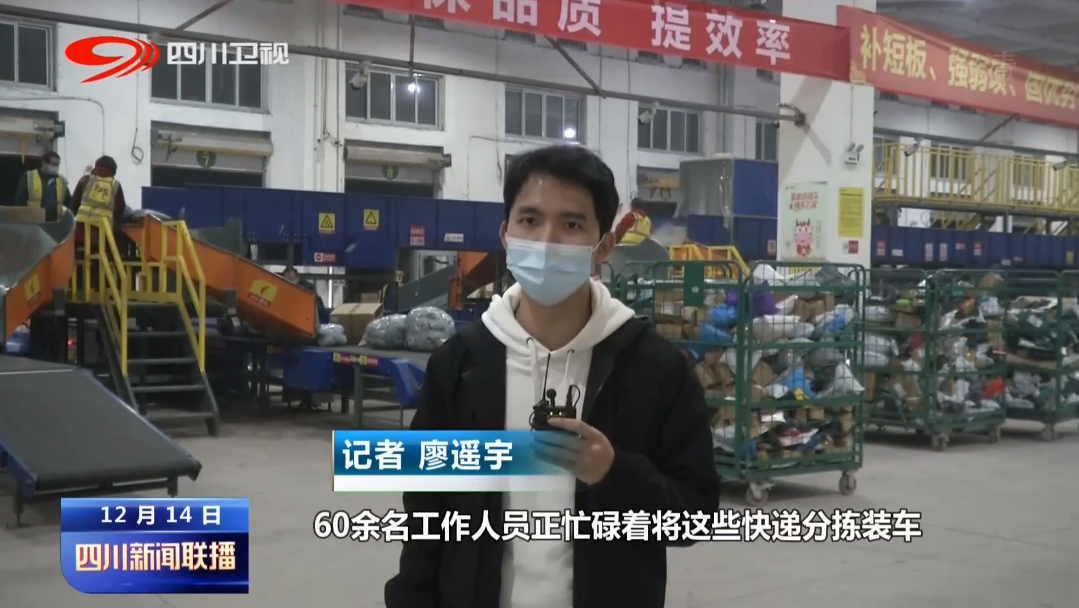 记者 廖遥宇:在我的身后,十多万件快递正在这里进行中转,六十余名工作人员正忙碌着将这些快递分拣装车,陆续发往全国各地。
