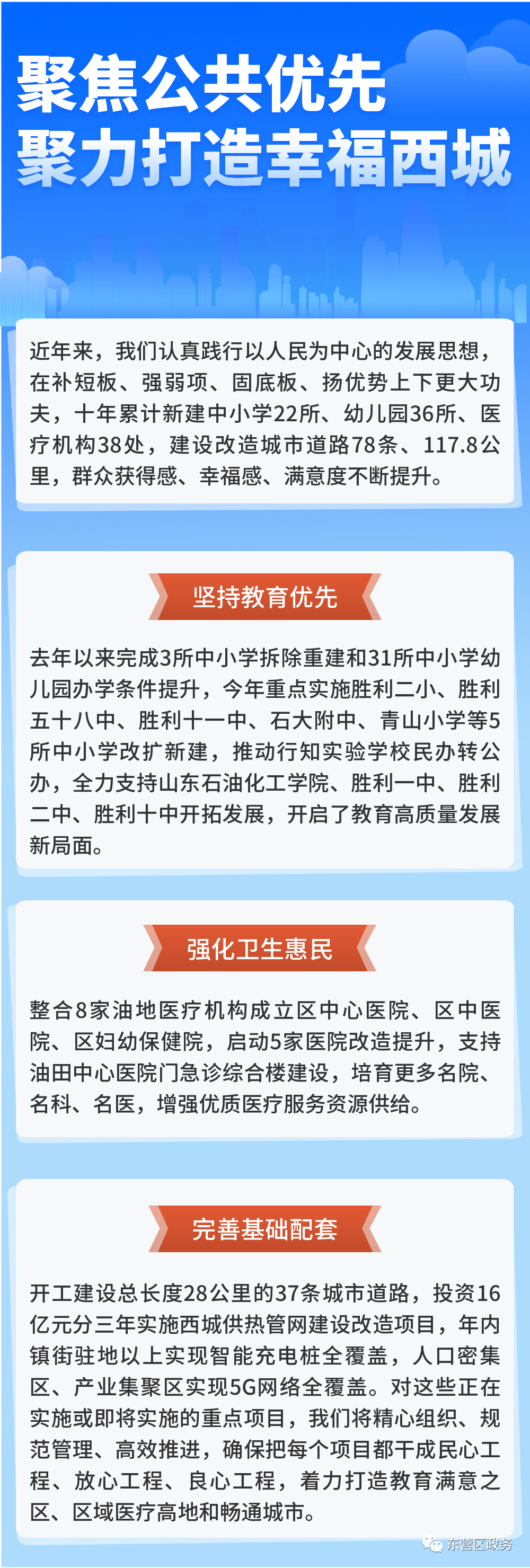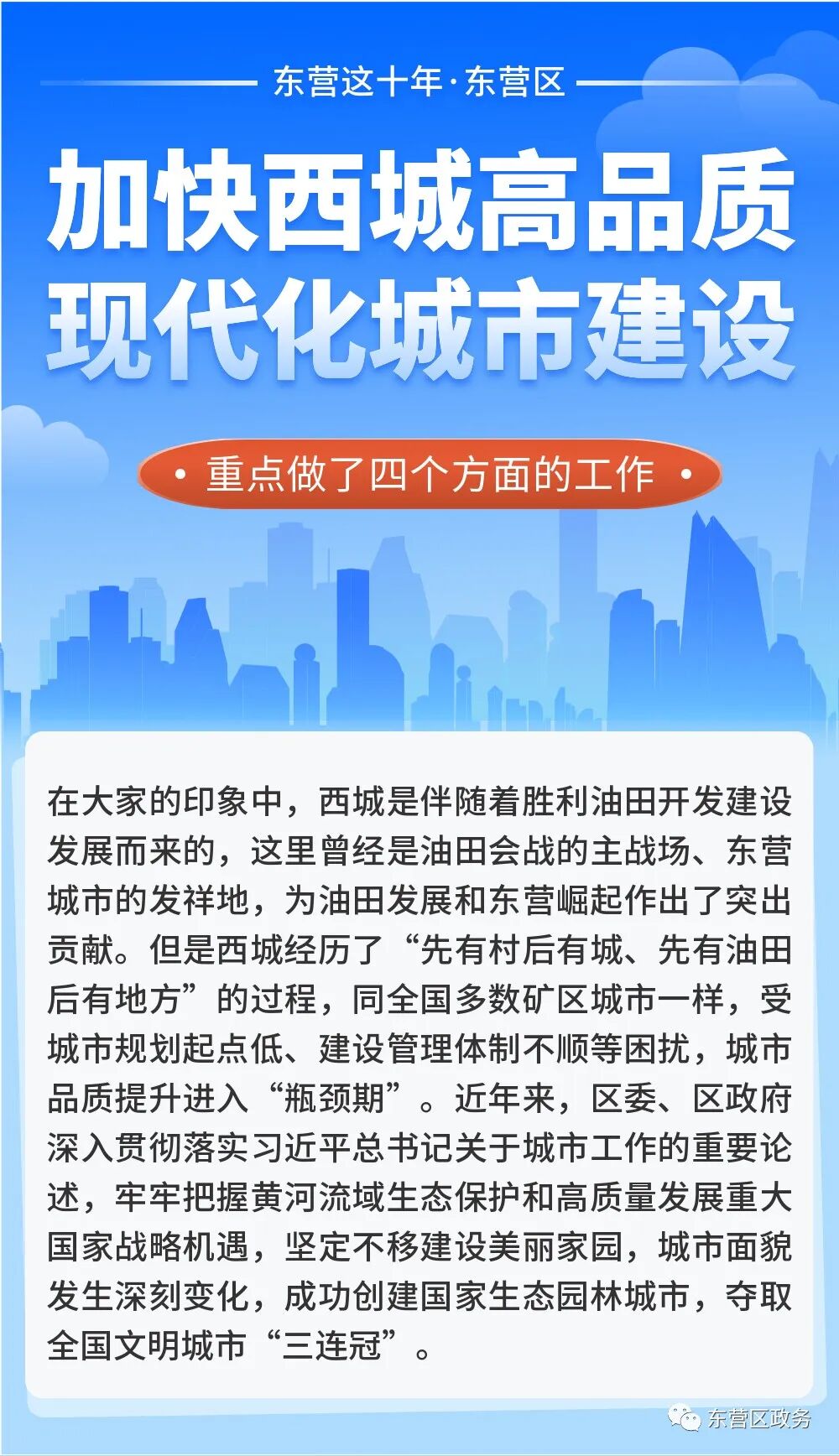 记者问:人民城市人民建、人民城市为人民。西城发端于1963年油田“基地”建设,从发展时间看是一座年轻城市,但从城市现状看却是典型老城区。去年习近平总书记亲临东营视察,是对东营城市建设的全面检阅,既给我们城市建设带来重大机遇,也提出了更高要求。请问,十八大以来,东营区在落实人民城市理念,加快西城高品质现代化城市建设方面做了哪些工作,取得了哪些成效?